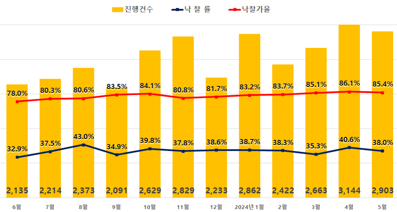 10일 경·공매 데이터 전문기업 지지옥션이 발표한 ‘2024년 5월 경매동향보고서’에 따르면, 전국 아파트 경매 진행건수는 2903건으로 전달(3144건) 보다 241건이 줄었다. 이 중 1103건이 낙찰되면서 낙찰률은 전월(40.6%) 보다 2.6%p 하락한 38.0%를 기록했다. 낙찰가율은 85.4%로 전달(86.1%) 대비 소폭(0.7%p) 떨어졌지만, 석 달 연속 85%선을 웃돌면서 전국 아파트 낙찰가율이 회복세를 보이는 분위기다. 평균 응찰자 수는 7.8명으로 전달(8.0명)과 비슷한 수준을 유지했다.