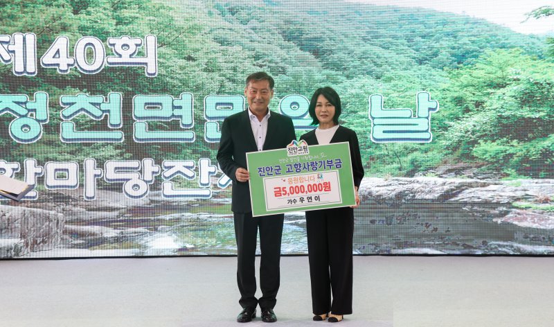 10일 진안군에 따르면 지난 8일 열린 정천면민의 날 행사에서 우연이 씨가 전춘성 진안군수에게 고향사랑기부금 500만원을 전달했다.