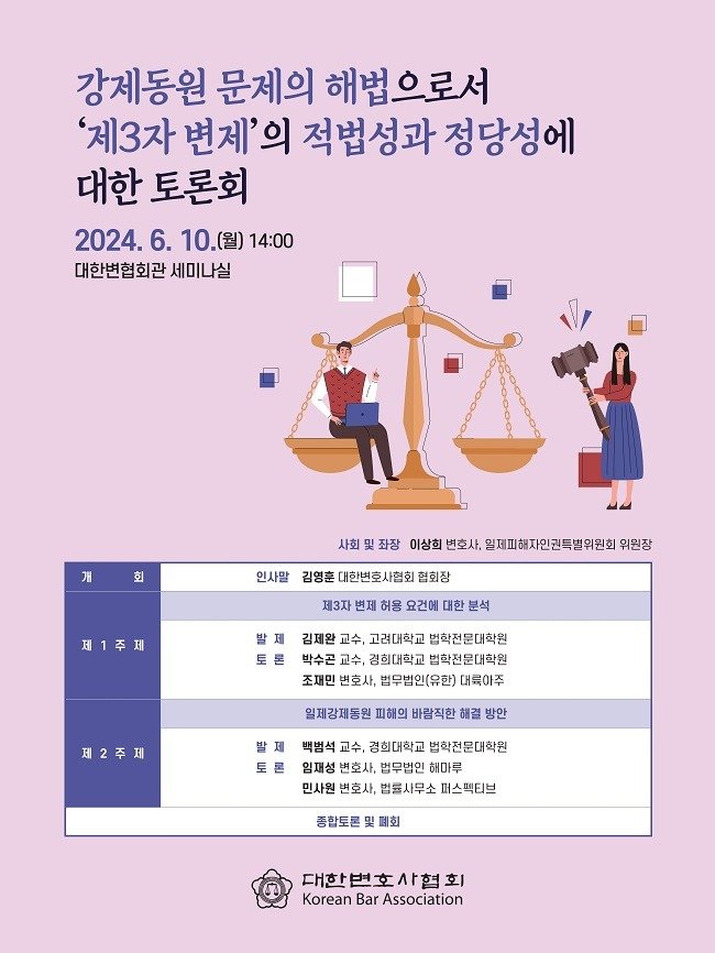 대한변호사협회(변협)는 10일 오후 2시 서울 서초구 대한변호사협회 회관에서 '강제동원 문제의 해법으로서 제3자 변제의 적법성과 정당성에 관한 토론회'를 열었다. 제3자 변제는 일제강제동원피해자지원재단이 전범 기업을 대신해 민간 기부금으로 피해자들의 배상금과 지연이자를 지급하는 방식이다.