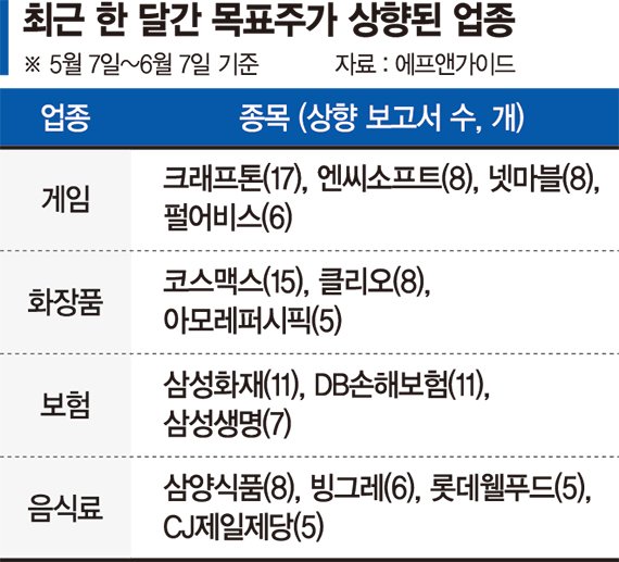 해외 실적 모멘텀이 부각된 화장품주들도 목표가 상향 리스트에 대거 포함됐다. 코스맥스(보고서 15개), 클리오(8개), 아모레퍼시픽(5개) 등이 증권가의 선택을 받았다. 특히 메리츠증권은 코스맥스의 목표가를 19만원에서 23만원으로, 클리오는 4만5000원에서 5만7000원으로, 아모레퍼시픽은 19만5000원에서 23만원으로 나란히 높였다.