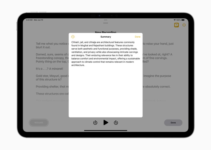 이같은 언어 능력은 텍스트에만 그치는 게 아니라 음성 영역까지 넓어진다. 이제 애플 인텔리전스를 통해 사용자는 메모 앱과 전화 앱에서 오디오를 녹음, 전사 및 요약할 수 있다. 통화 중에 녹음을 시작하면 당사자 모두에게 자동으로 녹음 사실이 알려지고, 통화를 마치면 애플 인텔리전스가 요약본을 생성해 요점을 되짚어볼 수 있게 해준다.