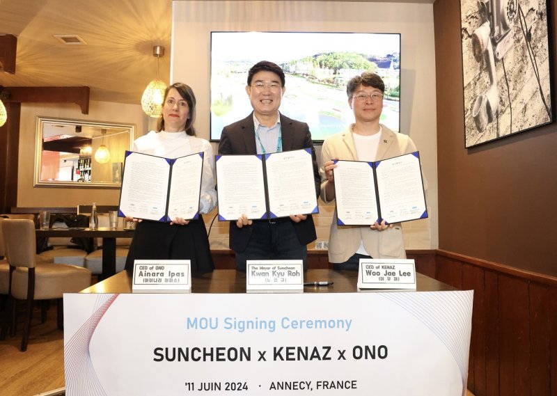 (순천=뉴스1) 김동수 기자 = 전남 순천시는 프랑시 안시에서 국내 웹툰기업 케나즈, 현지 콘텐츠기업 오노와 '글로벌 웹툰 인재 양성'을 위한 업무협약을 체결했다고 12일 밝혔다.