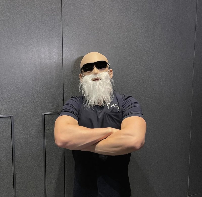 대머리 마스크, 선글라스, 흰 수염을 착용한 채 운동 관련 팁을 공유했다.