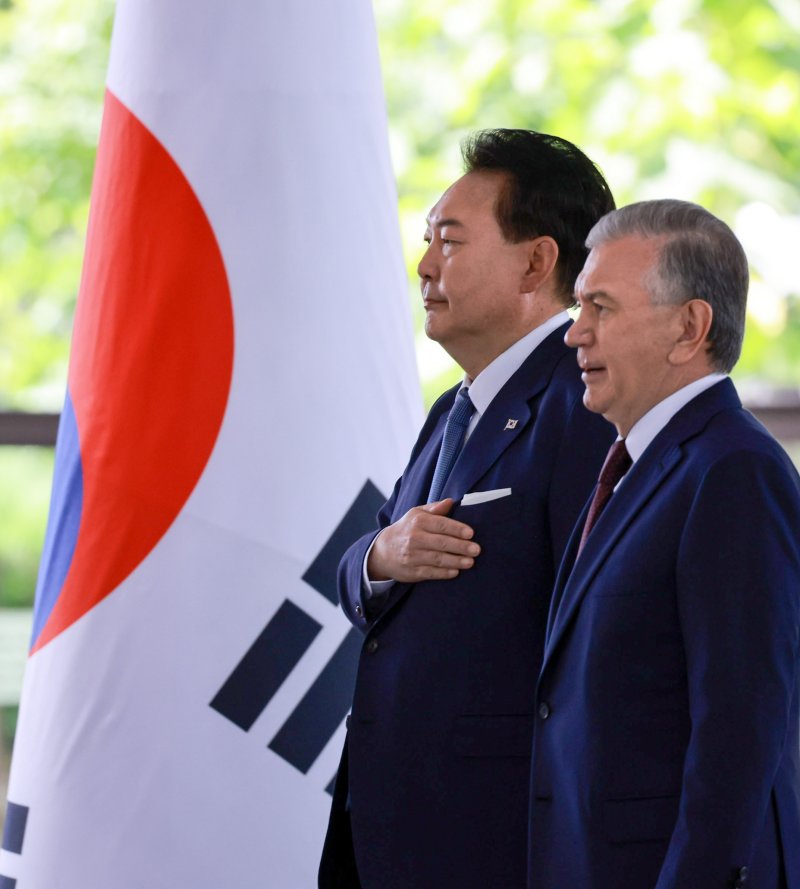 우즈베키스탄을 국빈 방문한 윤 대통령은 이날 타슈켄트 콕사로이 대통령궁에서 열린 정상회담 뒤 미르지요예프 대통령과 공동언론발표에 나섰다.