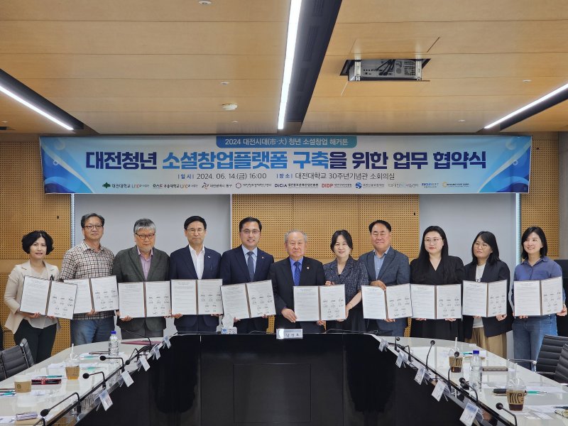 [대전=뉴시스]유순상 기자 = 대전대학교는 LINC3.0사업단이 지난 14일 교내에서 '2024년 대전청년 소셜창업 해커톤 플랫폼 구축' 협력 업무협약을 체결했다고 16일 밝혔다. 우송대와 동구청, 대전창조경제혁신센터 등이 참여했다.