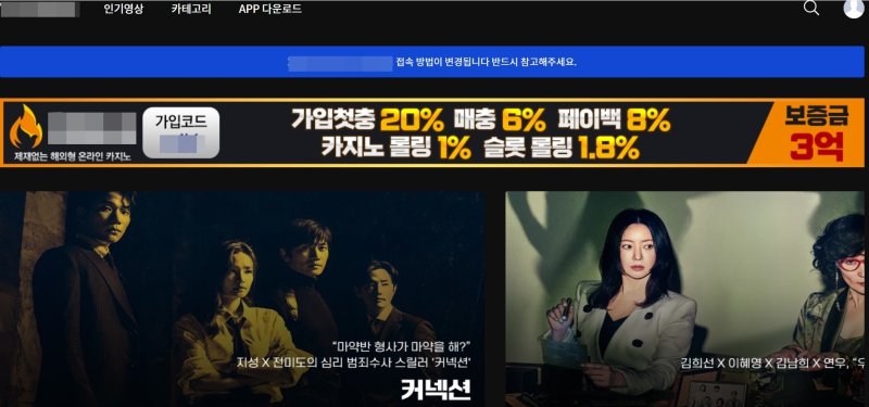 구글을 통해 접속한 A불법 스트리밍 사이트는 첫 화면부터 불법 온라인 카지노 사이트 광고와 드라마, 영화 등 콘테츠를 안내했다.