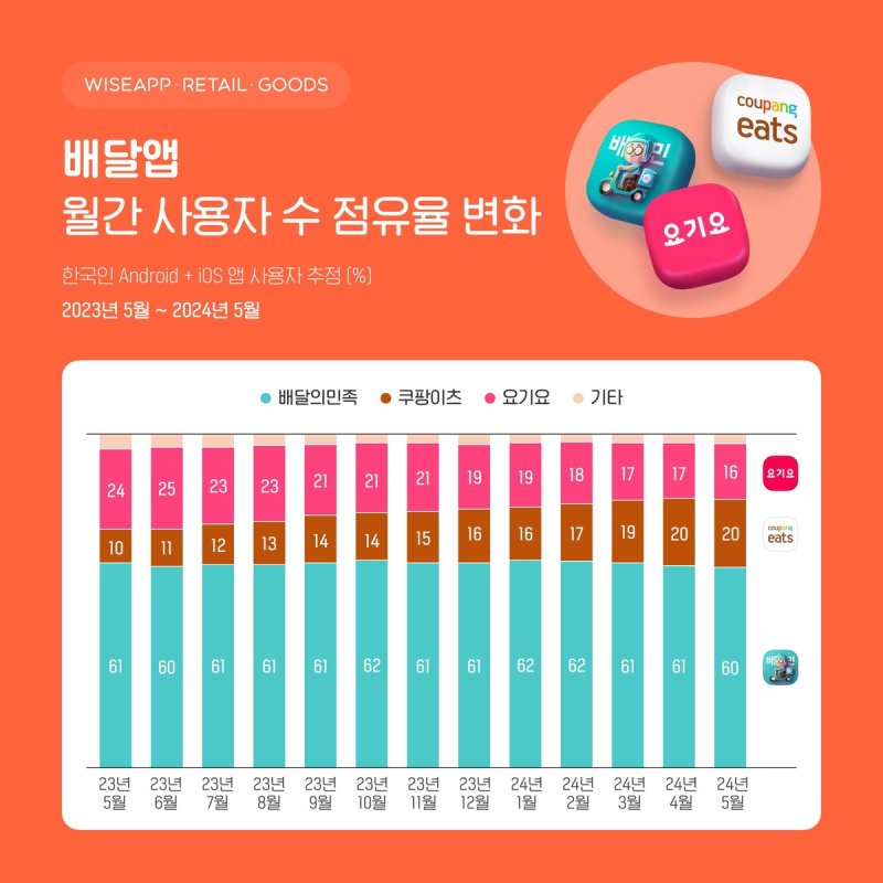 요기요 점유율은 16%로, 지난 3월 쿠팡이츠에 2위 자리를 내준 뒤 석 달째 3위에 머물렀다.