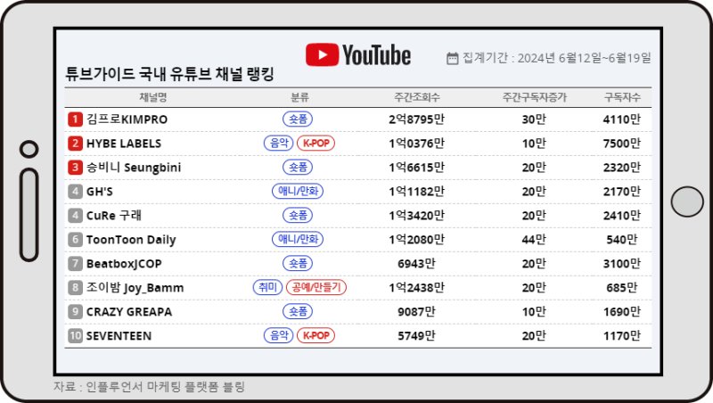 튜브가이드 6월 셋째주 국내 유튜브 채널 차트