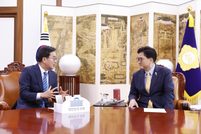(경기=뉴스1) 최대호 기자 = 김동연 경기도지사가 우원식 국회의장을 만나 권력구조 개편과 관련된 개헌에 대해 의견을 나누고 공감대를 형성했다.