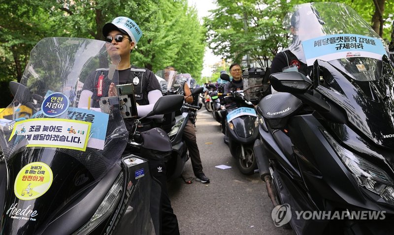 민주노총 공공운수노조 라이더유니온 지부 조합원 100여명은 이날 여의도 국회 인근에서 오토바이에 '배달 플랫폼의 갑질을 규제하라'고 적힌 손팻말 등을 붙이고 '배민 항의 행동'에 나섰다.