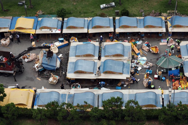 [부산=뉴시스] 하경민 기자 = 1960년대 초부터 영업을 한 부산 해운대 바다마을 포장마차촌이 추억 속으로 사라졌다. 25일 해운대구청 관계자들이 중장비를 동원해 포장마차촌을 철거하고 있다. 이 포장마차촌은 시유지 무단점용과 무신고 영업행위 등 논란이 끊이지 않았고, 해운대구는 2021년 상인들과 2년6개월의 유예기간을 거쳐 올 1월31일 자진 철거하기로 합의하고 이날 최종 철거에 나섰다. 2024.06.25. yulnetphoto@newsis.com [서울·부산=뉴시스] 류현주 하경민 기자 = 1960년대 초부터 영업을 한 부산 해운대 바다마을 포장마차촌이 추억 속으로 사라졌다.