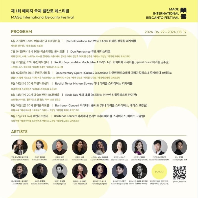공연기획사 메이지 프로덕션은 오는 29일부터 8월 17일까지 서울 예술의전당과 롯데콘서트홀, 경기 부천 부천아트센터에서 '제1회 메이지 국제 벨칸토 페스티벌'(MIBF 2024)을 연다고 25일 밝혔다.