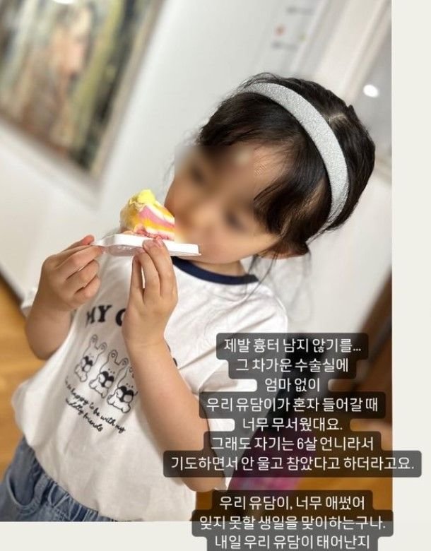 이하정에 따르면, 유담 양은 전날 돌부리에 걸려 넘어져 돌에 이마가 찍히는 부상을 입었다. 이하정은 "유담이 혼자 차디찬 수술실에 들여보내고, 그래도 이만 한 게 다행이라며 아이가 울지 않고 혼자 수술실에 의젓하게 들어가 준 것 만으로도 너무 기특하고 감사했어요"라고 딸에게 고마워했다.