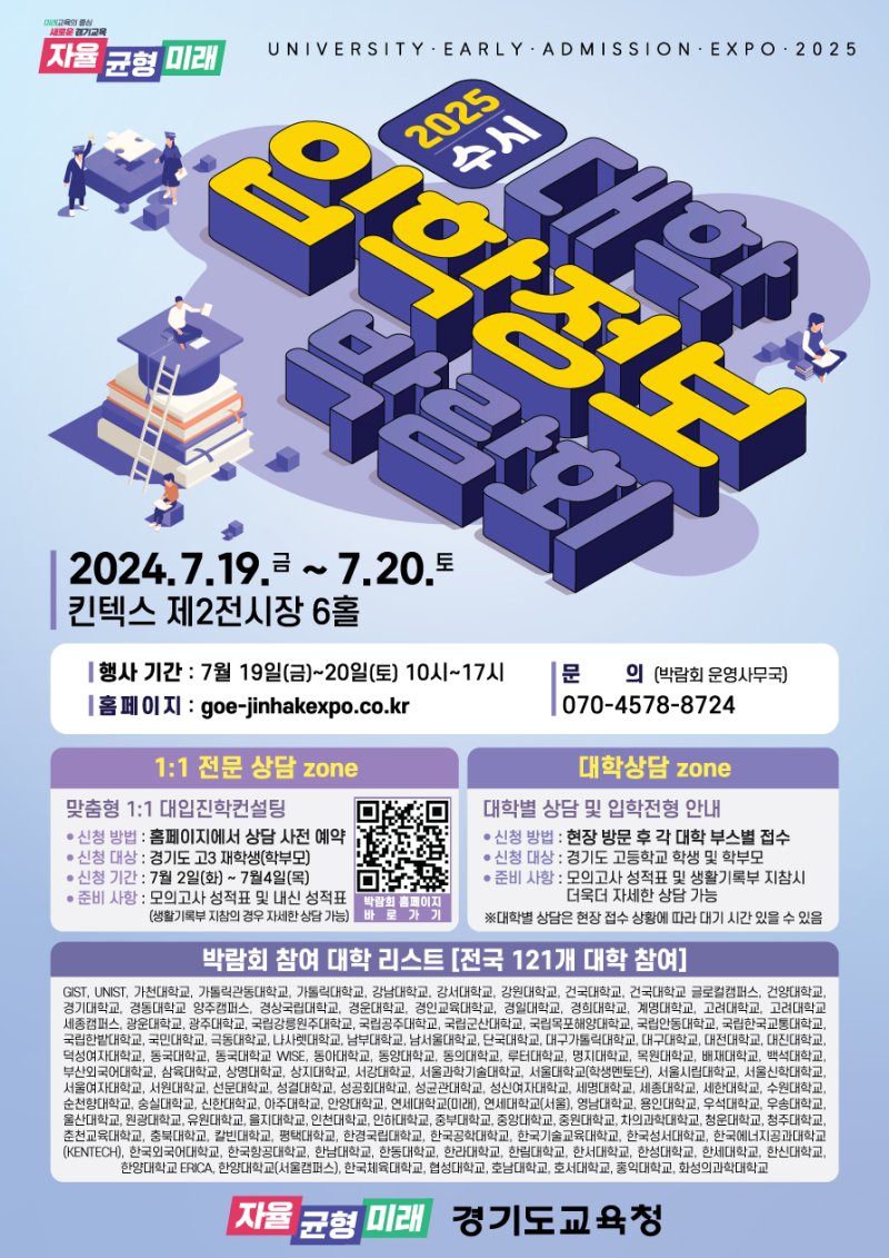 단, 1:1 무료 대입진학 컨설팅은 2일간 600명을 대상으로 사전 선착순 신청을 받는다. 희망하는 고3 학생과 학부모는 7월 2일부터 4일까지 박람회 누리집(goe-jinhakexpo.co.kr)에 접속해 신청하면 된다.