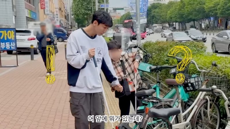 둘은 흰지팡이 끝으로 길바닥을 더듬으며 점자블록을 함께 찾아다녔다. 하지만 블록을 찾은 지 몇 초 되지 않아 태윤이 "여기 뭐가 있는데"라며 발걸음을 멈췄다.