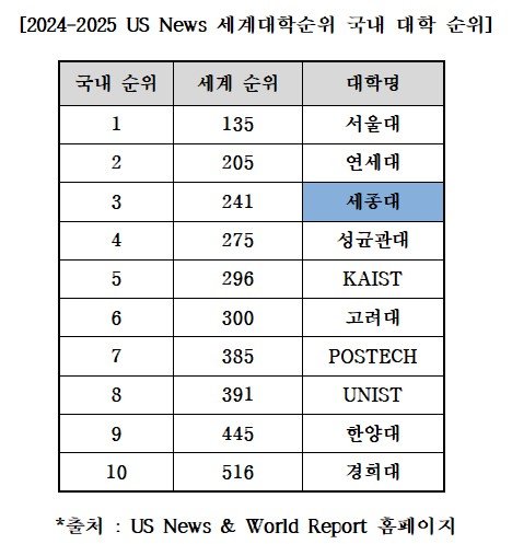 [서울=뉴시스]박지은 인턴 기자 = 세종대는 US News가 발표하는 'US News 2024-2025 세계대학순위'에서 국내 3위에 오르는 쾌거를 이뤄냈다고 28일 밝혔다.