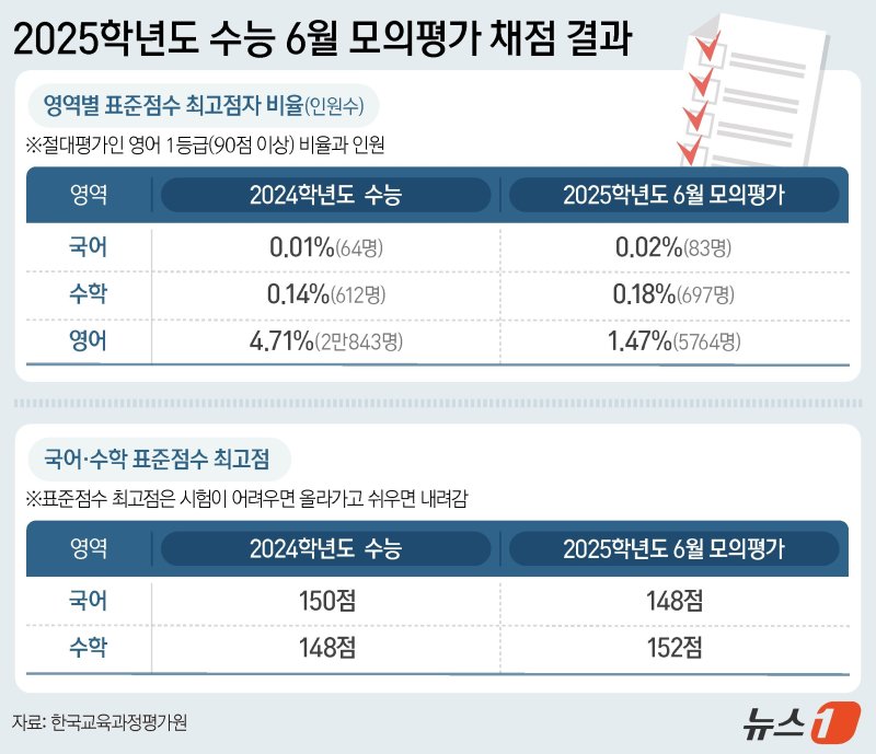 수능 출제기관인 한국교육과정평가원(평가원)은 1일 '2025학년도 수능 6월 모의평가 채점 결과'를 발표했다. 평가원은 '킬러문항'(초고난도 문항)을 배제하고 적정 변별력을 확보하겠다고 밝혔지만 국어, 수학, 영어 모두 매우 어려웠다.