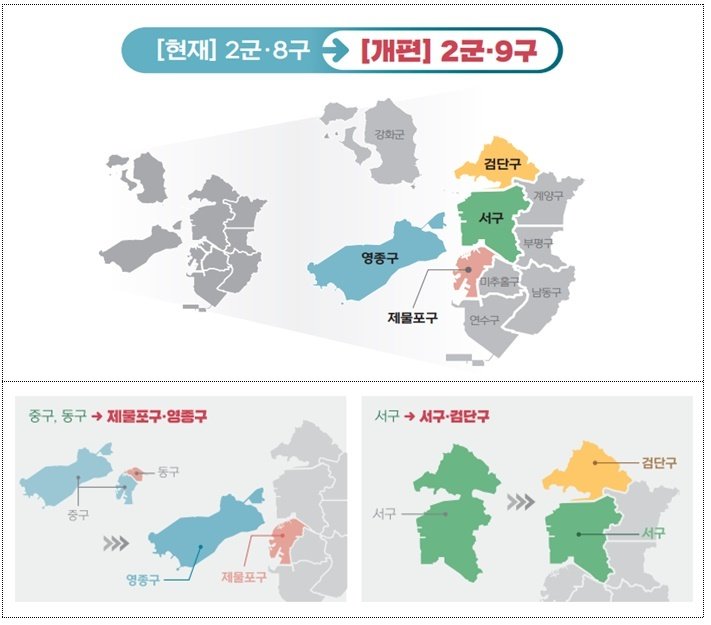 시에 따르면 인천형 행정 체제 개편은 현행 '2군·8구'를 '2군·9구'로 변경하는 것이다. 중구·동구의 육지 지역은 '제물포구'로, 중구 영종도는 '영종구'로, 서구 검단지역은 '검단구'로 각각 변경된다.