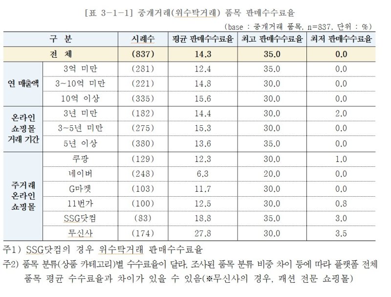 그 결과 평균 판매수수료율은 온라인쇼핑몰 14.3%, 숙박앱 11.5%로 나타났다.