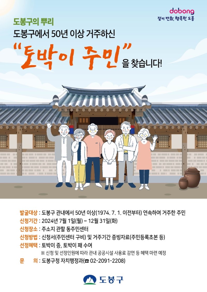 도봉구 "50년 산증인 '토박이 주민' 찾습니다"1974년 7월 1일 이전부터 도봉구에 연속 거주한 주민 대상