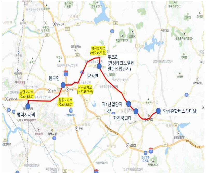 신설 노선의 배차간격은 20~25분이다. 안성종합버스터미널을 기점으로 한경국립대, 제1산업단지, 양성면, 국도45호선(양성~칠곡교차로), 원곡면 및 국도45호선(청용~송탄교차로)을 경유해 종점인 평택지제역까지 운행한다.