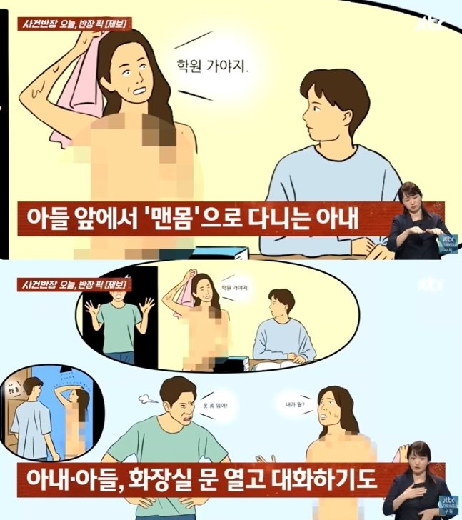3일 JTBC '사건반장'에 따르면, 고등학교 1학년 아들을 둔 A씨는 "아내가 결혼하고부터 샤워하면 항상 맨몸으로 나온다. 샤워하는 도중에도 문을 열고 아들과 대화를 나눈다"라고 토로했다.