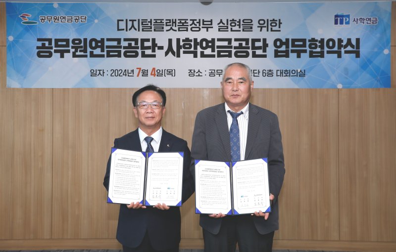 사학연금은 전날 송하중 이사장이 공무원연금공단 제주 본사에서 김동극 공무원연금 이사장과 '디지털플랫폼 정부' 구현을 위한 업무협약을 체결하고 긴밀한 협력체계를 구축키로 뜻을 모았다고 5일 밝혔다.