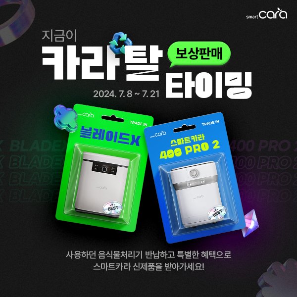 스마트카라는 행사 기간 보상판매 프로모션을 통해 스마트카라 음식물처리기를 구매할 시 ▲블레이드X 40만원 ▲스마트카라 400 Pro 2 31만원 즉시 할인 혜택을 제공한다.