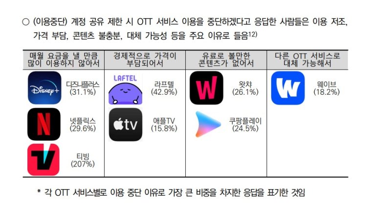 OTT 별로는 애플TV, 쿠팡플레이, 디즈니플러스 등 순으로 이용을 중단하겠다는 비중이 높았다.