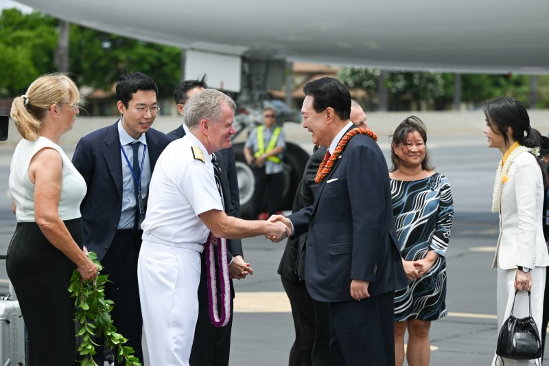 (호놀룰루=뉴스1) 정지형 김정률 기자 = 윤석열 대통령은 2박 5일간 이어지는 북대서양조약기구(NATO·나토) 정상회의 순방 첫 일정지인 미국 하와이에 8일(현지시간) 도착했다.