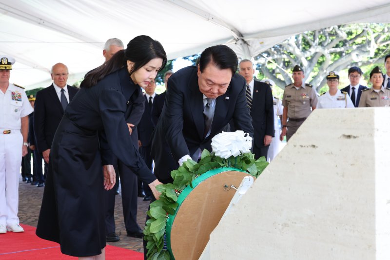 [호놀룰루=뉴시스] 최진석 기자 = 윤석열 대통령과 부인 김건희 여사가 8일(현지시각) 미국 하와이 국립 태평양 기념묘지에 헌화하고 있다. 2024.07.09. myjs@newsis.com [호놀룰루=뉴시스] 박미영 조수정 최진석 기자 = 윤석열 대통령과 부인 김건희 여사가 8일(현지시각) 오후 하와이 호놀룰루에 있는 미국 국립 태평양 기념묘지를 찾아 참배하고 참전용사들을 추모했다.