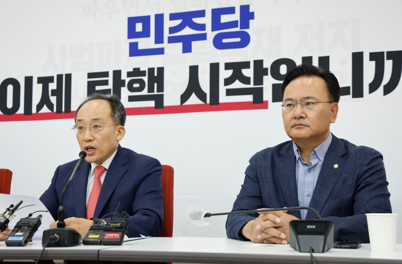 추 원내대표는 "오로지 사법리스크가 현실로 다가오는 이재명 전 대표를 방탄하기 위한 국면 전환용이자 극도의 국정 혼란만 초래할 정쟁만을 위해 위법적 청문회까지 추진하는 것"이라며 "오늘 당대표 연임 위해 출마선언하는 이재명 대표에게 요구한다. 민주당 당대표로서 이번 위법적 탄핵청문회에 대해 분명한 입장을 내놔라"고 공세를 이어갔다.