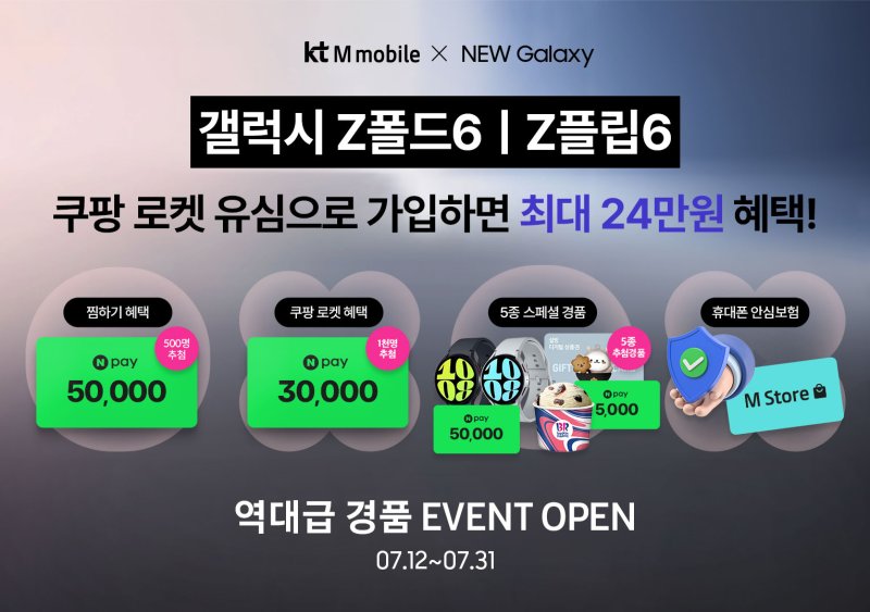 KT엠모바일은 총 2000명 대상 추첨을 통해 다양한 경품을 제공한다. 다이렉트 몰에서 갤럭시 Z6 시리즈를 찜하고 신규 가입 시 네이버페이 포인트 5만원(500명 추첨)을 증정한다. 또한 500명 고객 추첨을 통해 ▲갤럭시 워치6(5명) ▲네이버페이 포인트 5만원(20명) ▲베스킨라빈스 하프갤론(35명) ▲설빙 3만원권(40명) ▲네이버페이 포인트 5000원(400명)을 제공한다. 쿠팡 로켓배송으로 KT엠모바일 유심 구매 후 가입 시 네이버페이 포인트 3만원(1000명 추첨)을 증정한다.