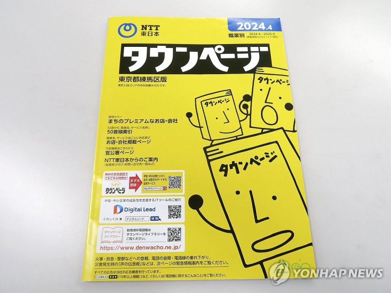 (도쿄=연합뉴스) 박상현 특파원 = 일본 통신회사 NTT 동일본과 NTT 서일본이 전국 점포와 기업 연락처를 업종별로 기재한 무료 전화번호부 '타운 페이지' 책자 발행을 끝내기로 했다고 아사히신문과 산케이신문 등이 12일 보도했다.