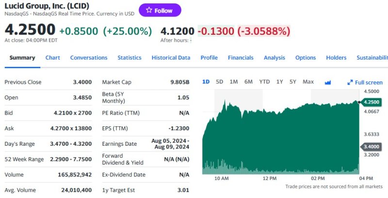 12일(현지시간) 뉴욕증시에서 루시드는 전거래일보다 25% 폭등한 4.25달러를 기록했다.