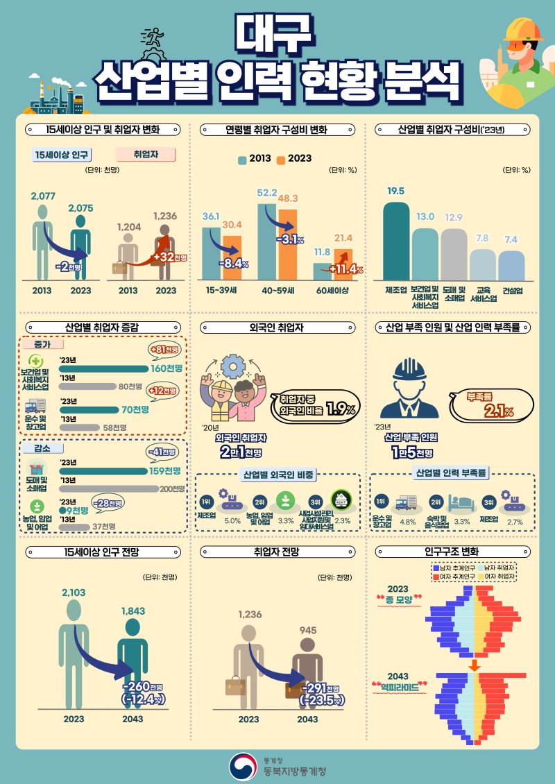 동북지방통계청은 대구광역시와 경상북도의 인구 및 산업 정책을 지원하기 위해 지역별고용조사와 장래인구추계 등을 활용하여 경북 취업자의 학력, 산업·직업, 외국인 비율, 부족 인원 등 인력 현황을 분석했다.