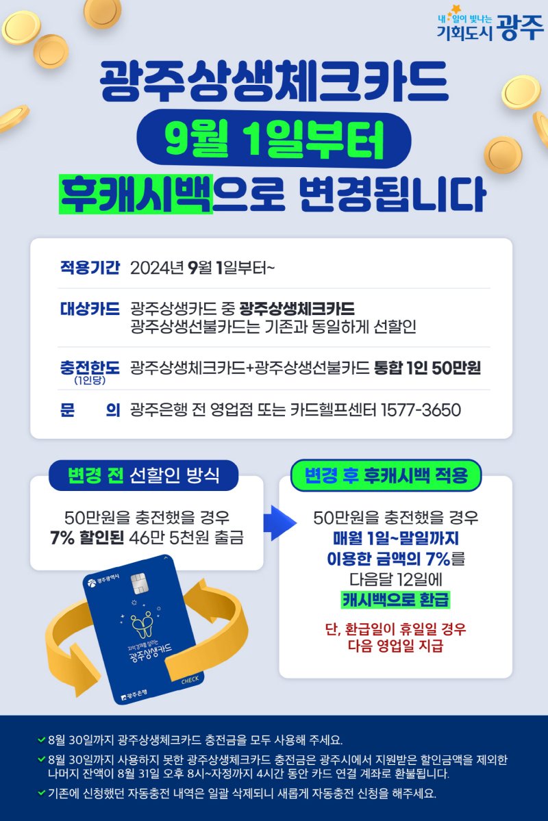 광주시는 오는 9월 1일부터 광주상생체크카드의 할인지원방식이 충전금액의 7%를 할인해 주는 선 할인에서 충전금액을 사용한 후 7%를 환급(캐시백)해주는 방식으로 바뀐된다고 18일 밝혔다.