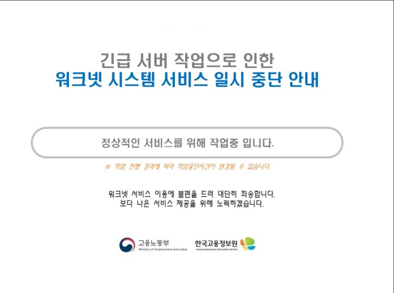 18일 고용부에 따르면 이날 오전 9시15분께 고용24, 워크넷, 고용보험, HRD-Net, 외국인고용관리시스템(EPS), 취업이룸 등의 홈페이지, 앱, 업무처리 시스템에서 접속 장애가 발생했다.