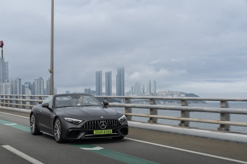 [서울=뉴시스]안경무 기자 = 지난 17일 부산시 기장군 편도 55㎞ 도로에서 메르세데스-AMG SL 63 4MATIC+(SL)을 시승했다. SL은 벤츠가 1954년부터 생산 중인 로드스터(2인용 컨버터블)로 독일어로는 Super Leicht, 영어로는 Super Light의 약자다.