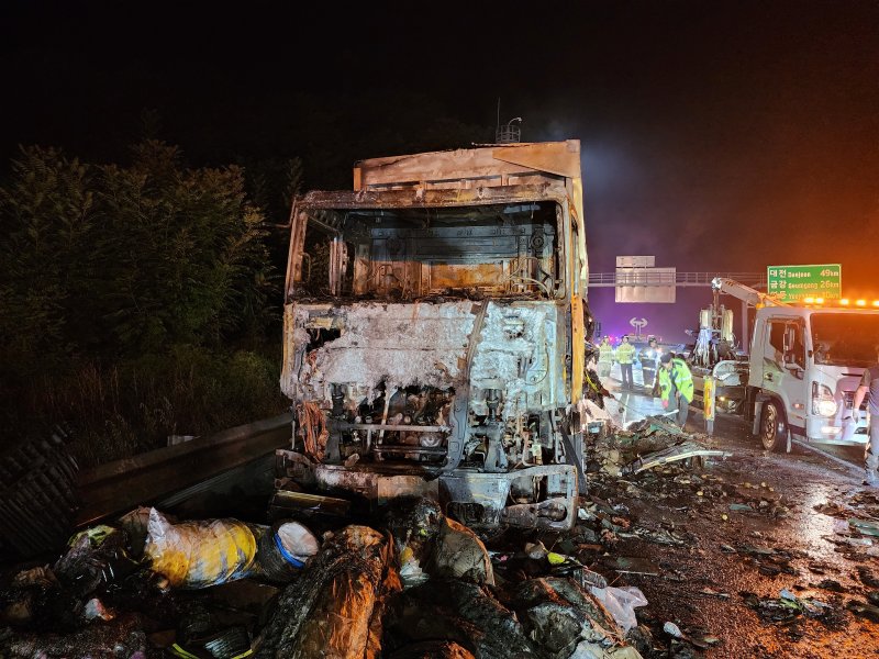 (영동=뉴스1) 이재규 기자 = 18일 오후 11시쯤 충북 영동군 황간면 경부고속도로 부산 방향 황간IC 인근에서 A 씨(54)가 몰던 17톤 화물차에서 화재가 발생했다.