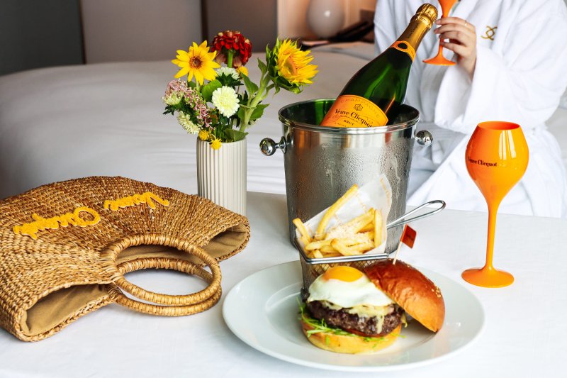 석촌호수 조망 럭셔리 레이크 룸에서 '뵈브 클리코 옐로우 레이블 브뤼'(Veuve Clicquot Yellow Label Brut) 샴페인 1병과 6층 파리지앵 라운지 '레스파스'(L'Espace)의 '뵈브 클리코 버거'를 인 룸 다이닝 서비스로 음미할 수 있다. 풍부한 육즙을 머금은 쇠고기 패티 위에 부드러운 써니 사이드 업이 올라간 이 버거는 샴페인과 절묘한 마리아주를 이룬다.