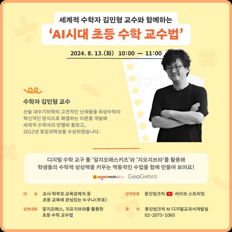 [서울=뉴시스]이승주 기자 = 웅진씽크빅이 AI 디지털교과서 도입 전 초등교사 대상 수학 교구 툴인 '알지오매스'와 '지오지브라'를 활용한 수학 노하우를 공유하기 위해 온라인 강연을 실시한다고 22일 밝혔다.