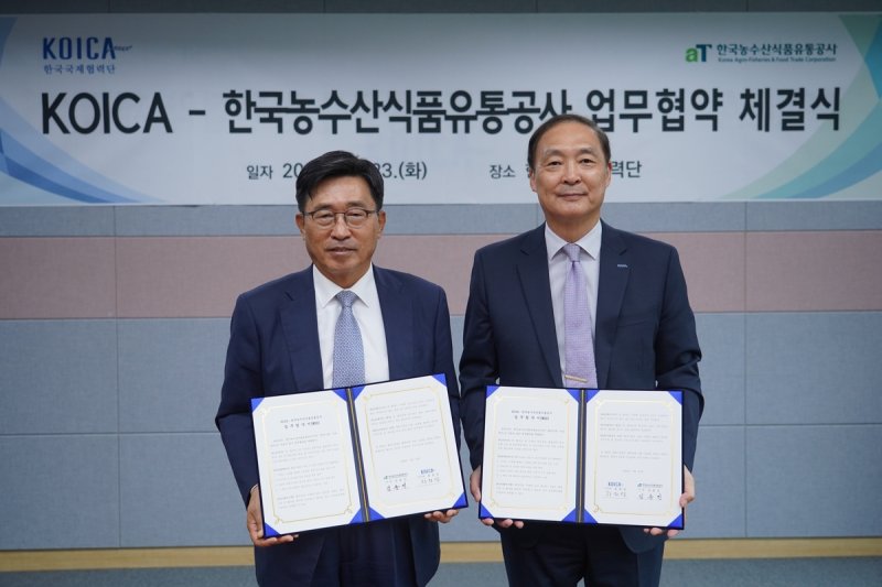 (서울=연합뉴스) 김지선 기자 = 한국국제협력단(KOICA·코이카)은 23일 오후 경기 성남시 코이카 본부에서 한국농수산식품유통공사와 '저탄소 식생활 확산을 위한 업무협약'을 체결했다고 밝혔다.
