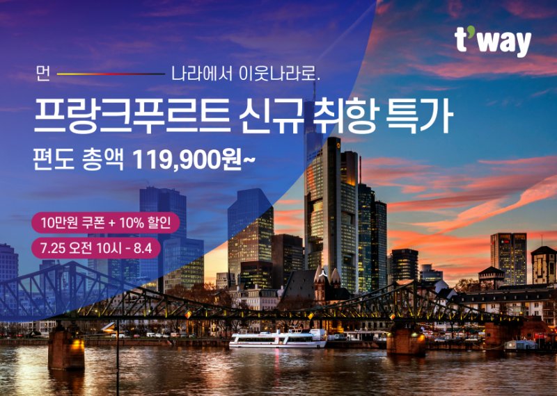 티웨이항공은 이번 인천~프랑크푸르트 노선 취항을 기념해 29일 오전 10시부터 이틀간 역대급 초특가 1만원 운임 프로모션을 선보인다.