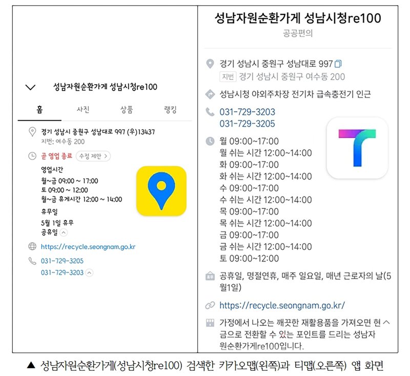 시는 성남자원순환가게에 대한 시민 정보력을 높이기 위해 지난 9일 네이버 지도에 이어 최근 카카오맵과 티맵 운영사에 등록 절차를 마쳤다며 이같이 전했다.