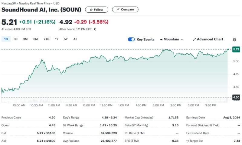 8일(현지시간) 뉴욕증시에서 사운드하운드는 전거래일보다 21.16% 폭등한 5.21달러를 기록했다.