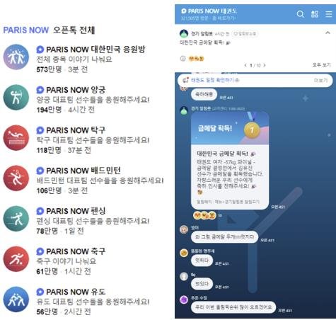 11일 정보통신기술(ICT) 업계에 따르면 네이버의 2024 파리올림픽 오픈톡 38개 중 참여자가 가장 많은 'PARIS NOW(파리는 지금) 대한민국 응원방'의 누적 방문자는 지난 주말 570만 명을 돌파했다.
