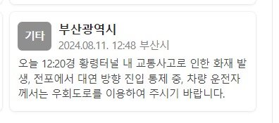 부산시는 낮 12시48분쯤 안전안내문자를 통해 “횡령터널 내 교통사고로 인한 화재로 전포에서 대연방향 도로가 통제 중으로, 차량 운전자는 우회도로를 이용해달라”고 당부했다.