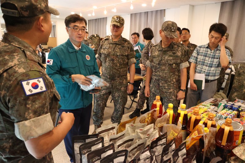 (대전ㆍ충남=뉴스1) 박찬수 기자 = 조달청이 13일 육군 35사단 군산대대를 방문, 군 장병들에게 보급되는 급식, 피복류 등 군수품 공급 현황을 점검했다.