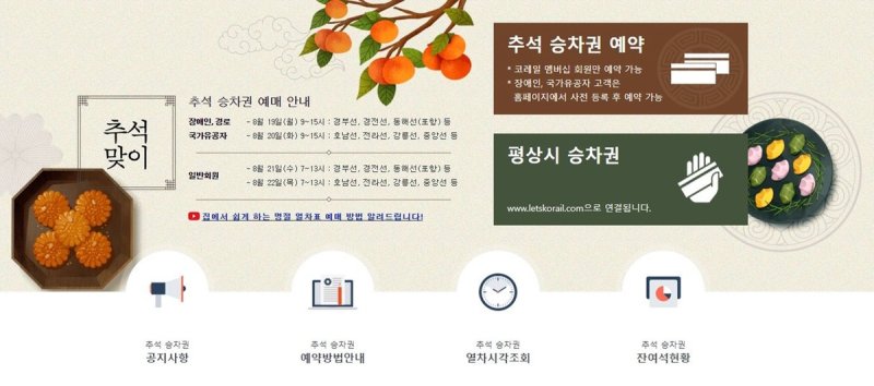 코레일은 교통약자의 명절 승차권 예매를 배려하기 위해 오는 19∼20일 별도 예매를 진행하고, 21∼22일은 모든 국민을 대상으로 한다.